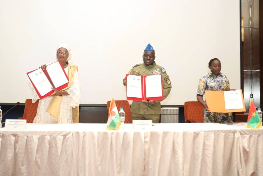 La cérémonie de signature a réuni le colonel-major Abdourahamane Amadou, ministre nigérien des Transports et de l’Aviation civile, Dembélé Madina Sissoko, son homologue malienne, ainsi que Kiswendsida Alice Ouédraogo, représentant le ministre d’État burkinabè en charge de l’Administration territoriale et de la Mobilité.