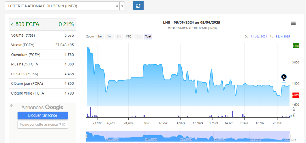 D’après les données du marché en date du 05/06/2025, le cours de l’action LNB est aujourd’hui fixé à 4 800 FCFA, soit exactement le prix d’introduction. Cette stagnation est significative à plusieurs égards :